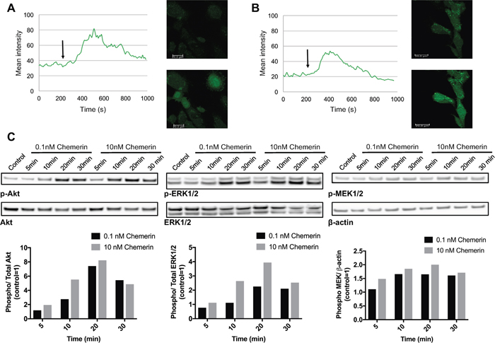 Figure 4: Chemerin induces intracellular calcium mobilization and stimulates MAPK and Akt signaling in neuroblastoma cells. Intracellular calcium mobilization was measured in SK-N-SH cells with confocal laser scanning microscopy following the stimulation with 10nM chemerin without (A) and with (B) the prior addition of the calcium chelator EDTA. The arrow indicates the time point when chemerin was added. (C) Chemerin stimulates the phosphorylation of Akt, ERK1/2 and MEK1/2 in SK-N-AS cells in a dose-dependent manner. The cells were serum-starved for 24h prior to stimulation and samples were taken 5, 10, 20 and 30min after stimulation. Densitometric analysis of the protein bands was performed and the ratios between p-ERK1/2 and total ERK1/2, p-Akt and total Akt as well as p-MEK1/2 and β-actin were calculated. The values are displayed relative to the control=1. The experiments were performed three times with similar results.
