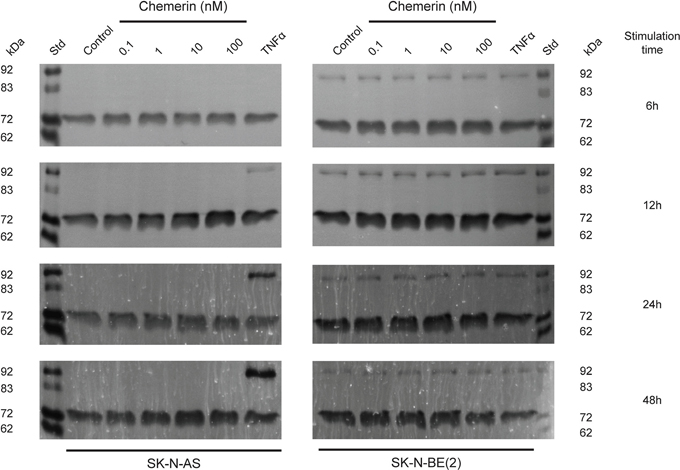 Figure 5: Chemerin stimulates MMP-2 synthesis in neuroblastoma cells. Typical real-time gelatin zymography of supernatants from SK-N-AS and SK-N-BE(2) cells untreated (control) or treated with increasing concentrations of chemerin (0.1-100 nM) or TNFα (10 ng/ml) for 6h, 12h, 24h and 48h. Prior to stimulation, the cells were serum-starved for 24h. For each zymogram the supernatants of three independent samples were pooled and analyzed. The shown zymograms were taken after optimal incubation time (for SK-N-AS 15h, 10h, 13h and 13h and for SK-N-BE(2) 15h, 10h, 5h and 4h) in assay buffer after the removal of SDS from the gels. The standard (st) comprised a mixture of proMMP-9 monomer (92 kDa), active MMP-9 (83 kDa), proMMP-2 (72 kDa) and active MMP-2 (62 kDa).