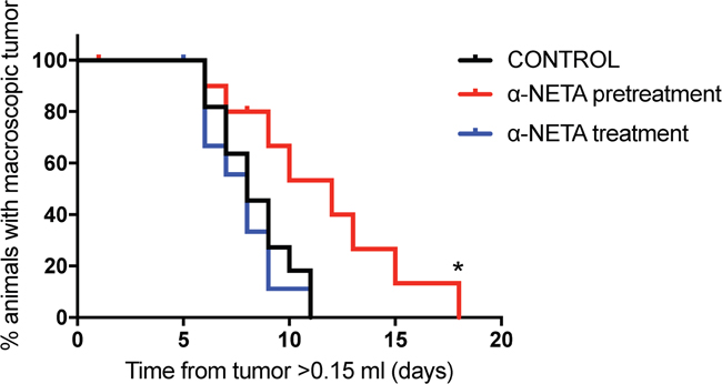 The therapeutic effect of CMKLR1 inhibition was examined in a SK-N-AS xenograft model. A significant prolongation (p=0.015, Log rank test) of survival (defined as time needed for the animals to grow a macroscopic tumor with a volume >1.5ml) was observed in the pre-treatment group, where the animals were treated s.c. with α-NETA continuously from day 1 after tumor cell injection, compared to the control group (Figure 7). In addition, when comparing tumor growth rates for individual tumors, the tumors from the pre-treated mice grew significantly slower than the tumors in the control group (p=0.0061, one way ANOVA with Bonferroni post-test, control vs. pre-treatment p=0.049, Supplementary Figure 4). However, no effect was seen in the treatment group, where α-NETA s.c. injections were initiated after the tumor reached a volume of ≥ 0.15ml, compared to the control group. No signs of toxicity were observed at the used concentrations of α-NETA. In the pre-treatment group, a hardening of the skin was seen at the later stages of the experiment probably due to the daily s.c. injection over a prolonged period. All mice gained weight over the course of the experiment.