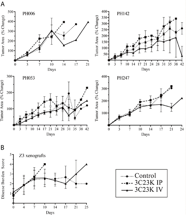 Figure 2: Efficacy of 3C23K in OC PDX models and Z3 xenografts. (A) Percent change in tumor cross-sectional area over time in MISIIR-H (top) and MISIIR-L (bottom) OC PDX models as determined by ultrasound twice weekly. (B) Change in disease burden score in Z3 xenografts during efficacy studies. Values reported as percent change at each day of treatment as compared to the beginning of treatment, or day 0.