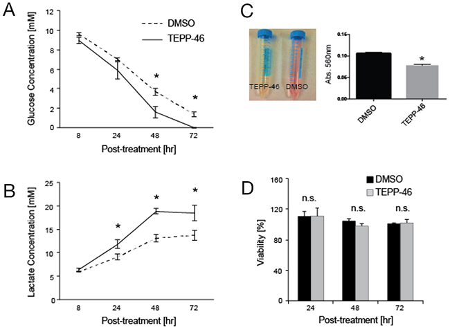 Consistent with previously published work [11], there was no significant change in cell viability when treated with TEPP-46 (Figure 1D).