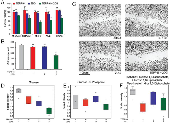 Figure 2: (A) Viability of a panel of cell lines (3 breast and 2 lung cancer) assessed by MTT assay after treatment using either TEPP-46, 2-DG or a combination of both. (B) Colony forming assay performed on H1299 lung cancer cells seeded at low density in the presence of monotherapy or combination therapy with TEPP-46 and 2-DG. (C) Representative images from a scratch-wound assay 48 h after application of either DMSO, TEPP-46, 2-DG or combination treatment. H1299 cells were grown to confluency and a single scratch was introduced to the monolayer before treatments were applied. Metabolic profiling of cells treated with drugs reveal perturbations in glycolytic intermediates, with combination therapy resulting in the lowest levels of glucose (D), glucose-6-phosphate (E) and fructose-1,6-bisphosphate (F) in cell extracts.