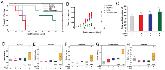 Figure 3: (A) Kaplan-Meier curve of four cohorts of mice (n = 5 each) treated with DMSO control, mono-, or combination therapy of TEPP-46 and 2-DG. Treatment was commenced after successful engraftment of xenograft (3-mm caliper measurement, approximately 10 days post-inoculation) and study was terminated as soon as tumors reached terminal diameters as defined by institutional guidelines. All treatments resulted in no significant difference in body weight at sacrifice compared to DMSO control (B). Metabolite profiling revealed higher levels of saturated fatty acids palmitate (C), stearate (D) and arachidate (E) as well as unsaturated fatty acids 5-dodecenoate (F) and adrenate (G) in tumors that continued growing 3 months post-combination treatment as compared to tumors that were combination-treated for 1 month.