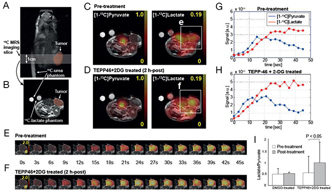 Figure 4: Acute metabolic responses of TEPP-46 and 2-DG combination treatment in subcutaneous tumor measured by hyperpolarized 13C MR spectroscopic imaging. Dynamic change in pyruvate metabolism was imaged over tumor-bearing slice (A, B) every 3 s. Time-averaged 13C-pyruvate, 13C-lactate, and lactate-to-pyruvate ratio maps (C, D) as well as dynamic images (E, F) displayed increased lactate labeling from the injected 13C-pyruvate in tumors from a representative combination treated mouse as compared to pre-treatment (G, H). No significant change in the lactate-to-pyruvate ratio was observed in DMSO-treated group (I).