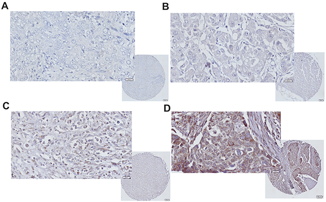 Figure 1: iNOS expression immunohistochemistry in TNBC. Representative images of TNBC tumor with (A) negative, (B) low, (C) moderate, and (D) strong iNOS tumor epithelial staining.