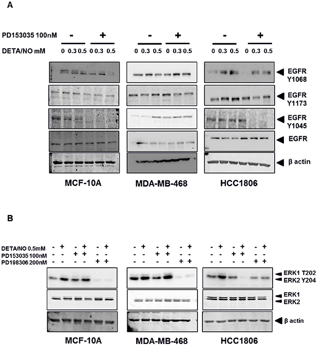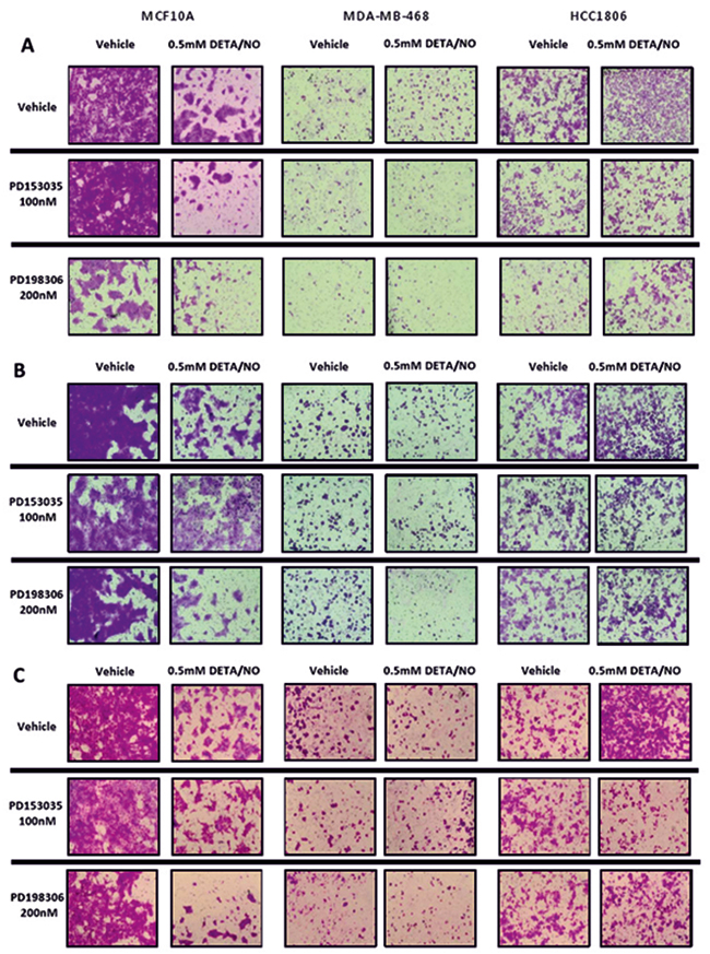 Cells were harvested and resuspended in RPMI1640 containing 5% of FBS at a concentration of 1x106 cells/ml. 100μl of the cell suspension and 100ul of DETA/NO and PD153035 or PD198306 at the appropriated concentrations were added to 8.0μm pore size inserts (Falcon), in a 24-well plate containing 0.5ml of RMPI1640 supplemented with 10% FBS. For the invasion assays, the inserts were previously coated with 1mg/ml of rat tail collagen (C7661 Sigma-Aldrich), or 0.2% of porcine skin gelatin (G1890 Sigma-Aldrich). Cells were incubated at 37°C for 24 hours for motility assays and 48 hours for invasion assays. After this time, the inner side of the insert was wiped with a wet cotton swab to remove the cells, while the outer side of the insert was gently rinsed with PBS and stained with 0.25% crystal violet for 5 minutes, rinsed again, and then allowed to dry. The inserts were then viewed under the microscope and the cells over a total of 5 random fields were counted at ×200 magnification, to determine the relative number of invading/migrating cells.