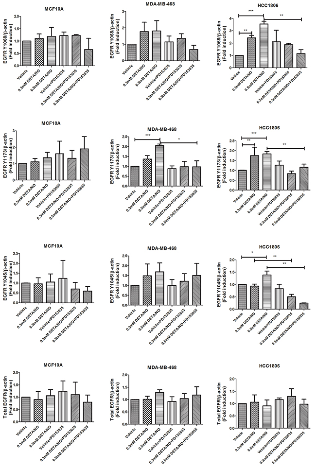 Nitric oxide (NO) is a small biomolecule which exerts multiple effects on tumor biology [7, 8]. NO regulates a wide range of intracellular events through s-nitrosylation and regulation cell redox [9, 10]. The biological effects of NO are dose and temporal dependent with the ability to either inhibit or stimulate cell proliferation, migration and apoptosis [7, 11, 12]. Inducible nitric oxide synthase (iNOS) is a pro-inflammatory enzyme implicated in chronic inflammation and wound healing which synthesizes NO [13]. We previously demonstrated that iNOS is associated with poor survival in ER-negative breast cancer patients and enhanced expression of basal-like gene signatures [14]. Additionally we demonstrated that iNOS was associated with epidermal growth factor receptor (EGFR) activation [14] via s-nitrosylation [9]. This led us to hypothesize that iNOS may play a role in the progression of basal-like TNBC via enhanced activation of EGFR signaling. This study aims to identify the degree to which iNOS pays a role in TNBC progression and patient survival, in addition to identifying whether NO related activation of key signaling pathways that mediate cell migration and invasion are dependent on the EGFR.