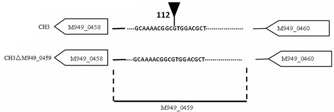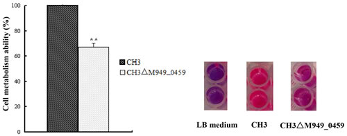 FAD-dependent oxidoreductase is a complex I NADH ubiquinone oxidoreductase that is crucial for transferring electrons into the respiratory chain in bacteria [21]. Mutations in FAD-dependent oxidoreductase may result in metabolic deficiencies. Based on the annotation of the M949_0459 as a putative FAD-dependent oxidoreductase in the GenBank, we tested the viability and metabolism of the bacteria using the alamarBlue assay. The results showed that the metabolic activity clearly decreased in the mutant strain CH3ΔM949_0459 compared with the wild-type strain CH3 (Figure 5).