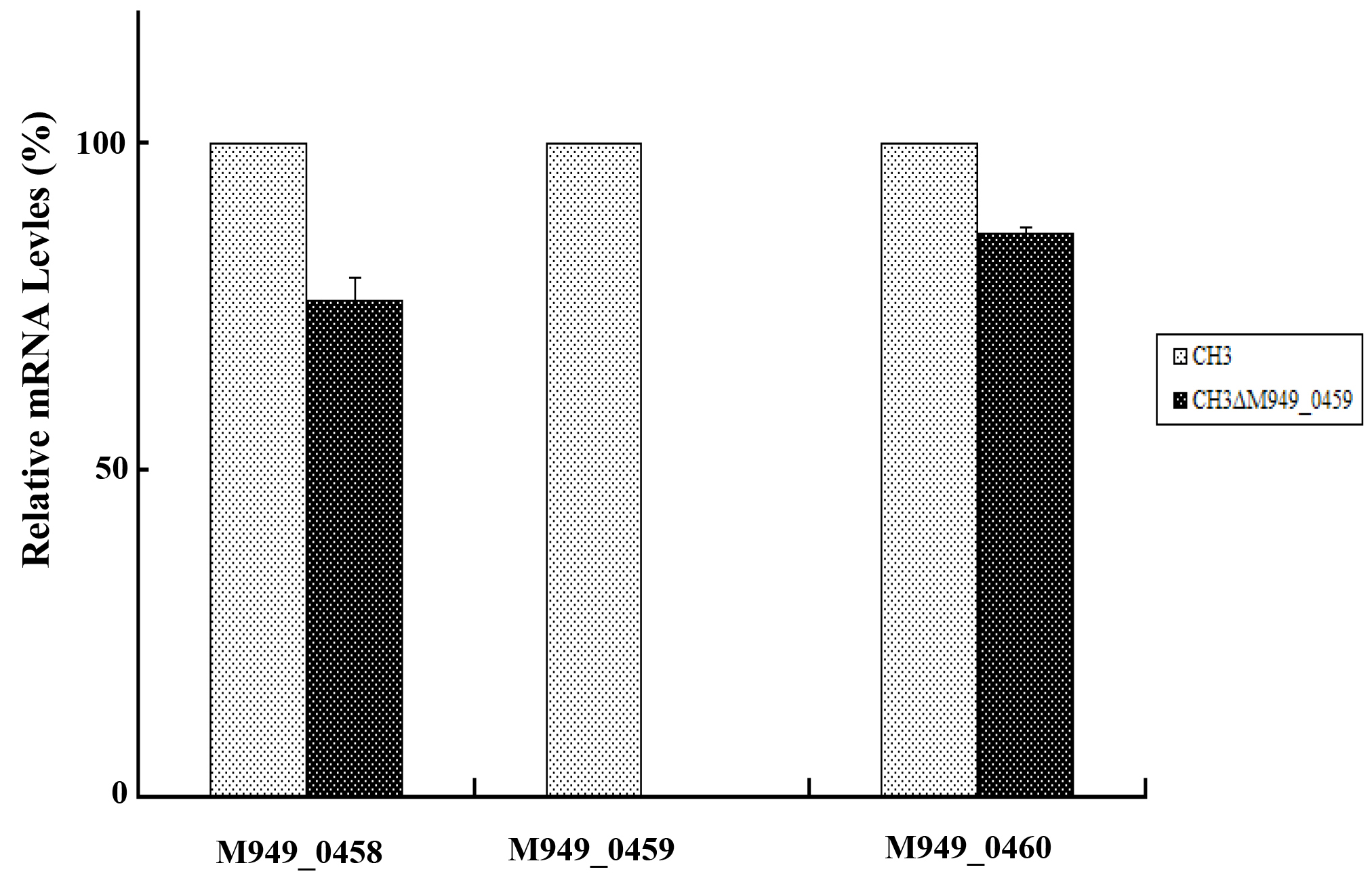 Figure 2: The M949_0459 gene deletion did not affect expression of its flanking genes. The expression of the M949_0459 and its flanking genes in the mutant strain CH3ΔM949_0459 and wild-type strain CH3 was determined using quantitative real-time PCR analysis. The expression of M949_0459 gene was inactivated in the mutant strain CH3ΔM949_0459, however, no significant difference was shown in expression of M949_0458 and M949_0460 genes between R. anatipestifer CH3 and CH3ΔM949_0459. Error bars represent standard deviations from three replicates.