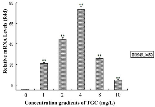 Figure 7: Tigecycline treatment changed the expression of M949_0459 gene. The expression of the M949_0459 gene following treatment with different concentrations of tigecycline was measured by quantitative real-time PCR. Error bars represent standard deviations from three replicates. **p < 0.01.