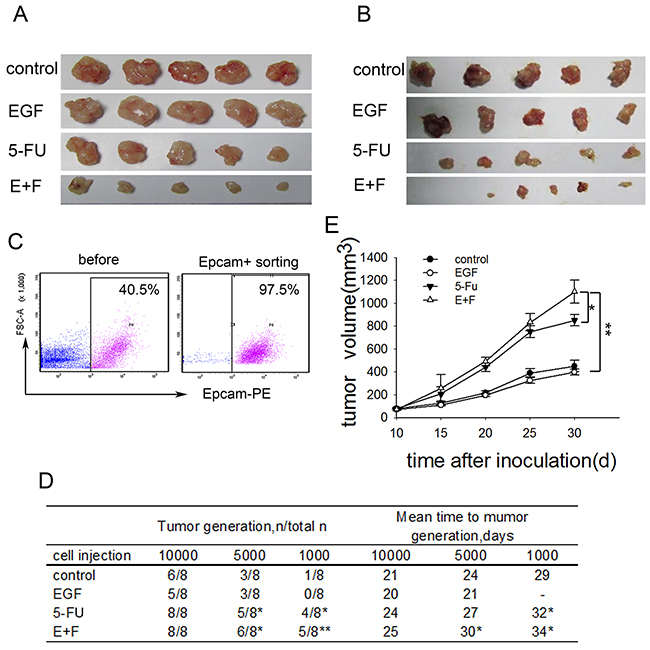 Figure 2: SCCs enriched by cell cycle inducer combined chemotherapy exhibit increased tumorigenicity in vivo. (A) Effect of combined treatment on tumor growth. Mice were subcutaneously inoculated with LoVo cells, and then received administration of EGF alone, 5-FU alone or combined treatment. Tumors (n=5 in each group) were dissected on day 30 after tumor inoculation. Representative tumor tissues were presented. (B) Nude mice subcutaneously inoculated with tumor cells from primary colorectal tumors received the same treatment as above. Representative tumor tissues were presented. (C) and (D) Tumor-generation assay using injection of tumor cells in a gradient dose. Tumor tissues from mice challenged with LoVo cells after above treatments were dissected and digested. Single cell suspensions were prepared. Tumor cells were enriched by EpCAM+ FACS sorting from single cell suspensions for all the cell groups (C) and subcutaneously inoculated into Nude mice again in a gradient dose. Tumor generation was observed (D). The t-test was carried out to determine the difference between experimental group and control group in three experiments. *P<0.05; **P<0.01. (E) Tumor growth in vivo. Tumors cells collected as above were subcutaneously inoculated into Nude mice at a high dose. Tumor growth was monitored at indicated time. Data are pooled from three independent experiments with a total of five mice in each group. Data are represented as mean ± SD. P values, *P<0.05, **P<0.01.