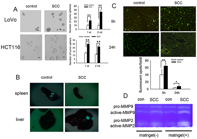 Figure 3: SCCs enriched by cell cycle inducer combined chemotherapy are stem-cell like and participate in metastatic dormancy. (A) Tumorsphere culture from control tumor cells (HCT116 and LoVo) and SCCs. Much more tumorspheres were obtained from SCCs for the first passage and the SCC tumorspheres can be more efficiently passaged and expanded (the second passage). Scale bars represent 50 μm. (B) Tumor metastasis to liver by intra-spleen injection. The mice were inoculated by intraspleen injection of control LoVo-GFP cells or SCCs-GFP. On day 35 after inoculation, mice were sacrificed and tumor nodes on both spleen and liver were observed. Representative tumor tissues were presented. (C) Tumor cell retention in lung by intravenous injection. Control LoVo cells or SCCs were labeled with CFSE and injected into mice via tail vein. Mice were killed 5 h or 24 h after the i.v. injection of tumor cells. The CFSE-labeled tumor cells in frozen sections were visualized and counted by fluorescence microscopy. (D) Production of MMP-9 and MMP-2 in the presence or absence of ECM molecules (matrigel). Control LoVo cells or SCCs were cultured in the presence or absence of matrigel. MMP-9 and MMP-2 in supernatants were detected by Zymography assay. Data are representative of three independent experiments (A, B, D) or pooled from three independent experiments with a total of five mice in each group (C). P values, *P<0.05, **P<0.01.
