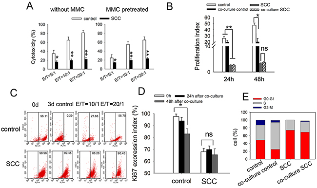 Figure 4: SCCs enriched by cycle-inducing combined chemotherapy are more resistant to DC-CIK-mediated cytotoxic killing in vitro. (A) Cytotoxicity assay of DC-CIK cells on indicated tumor cell. SCCs or control LoVo cells with (right) or without (left) MMC pretreatment were co-cultured with DC-CIK cells for 48h. The cytotoxicity was measured by CCK-8 assay. (B) Tumor cells were stained with CFSE and co-cultured with DC-CIK cells with a Transwell co-culture system at E/T radio of 20:1 for 24 h or 48 h. The proliferation of tumor cells was analyzed by flow cytometry, and proliferation index was calculated. (C) Lable-retaining tumor cells were enriched in vivo after treatment with DC-CIK cells. The CFSE-labled tumor cells were co-cultured with DC-CIK cells for 3 d. Lable-retaining tumor cells were analyzed by flow cytometry. Ki67 expression (D) and cell cycle distribution (E) of these tumor cells 3 days after co-cultured with DC-CIK cells were analyzed by flow cytometry. Data are pooled from three independent experiments with triplicate samples in each group. P values, *P<0.05, **P<0.01.