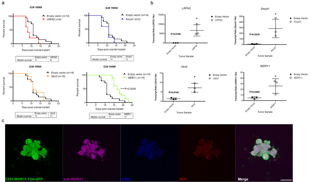 Figure 2: Functional study of genes mutated in mouse G3 MB. a. Survival of mice bearing mouse G3 MB tumorsphere line # 19568 overexpressing each of the four wild type genes; LRFN2 (red curve, top left panel), Smyd1 (blue curve, top right panel), Ubn2 (orange curve, bottom left panel), WRD11 (green curve, bottom right panel), or an empty vector as control for each panel (black curves); b. Relative qRT-PCR transcript ratios of LRFN2 (top left panel), Smyd1 (top right panel), Ubn2 (bottom left panel), and WDR11 (bottom right panel) in G3 MBs overexpressing each wild type gene (o) or an empty vector (•); c. Protein expression detected by immunofluorescence in tumorspheres derived from secondary tumors following intracranial implants of tumorsphere line #19568 (myc-IRES-RFP) transduced with lentiviruses encoding WDR11. Tumorspheres were immunostained with anti-GFP (Green) to visualize CDH-WDR11-T2A-GFP, anti-WDR11 detected with AlexaFluor 647 (purple), anti-RFP (red) to visualize Myc expression and nuclei counterstained with DAPI (blue). Scale bar = 20 µm.