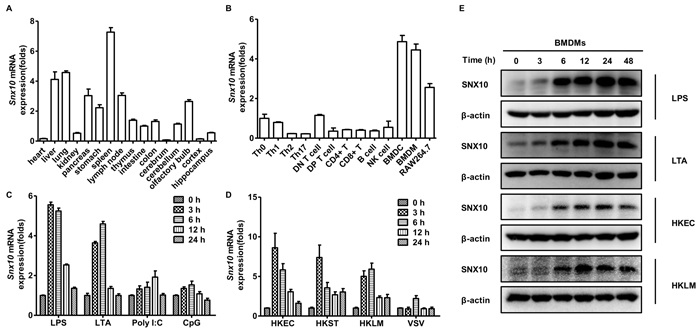 Figure 1: Expression of SNX10 in mouse tissues and cells. A., B. Q-PCR analysis of Snx10 expression in various mouse tissues A. and cells B.. C., D. Q-PCR analysis of Snx10 expression in BMDMs stimulated with LPS (100 ng/mL), LTA (2 μg/mL), Poly I:C (20 μg/mL), or CpG (0.3 μM) C. or infected with HKLM, HKEC, or HKST at a MOI of 20 or VSV at MOI of 1 D. for the indicated times. Data were normalized to the expression of the GAPDH gene. E. Immunoblot analysis of SNX10 protein levels in lysates of BMDMs stimulated with LPS (100 ng/mL) or LTA (2 μg/mL), or infected with HKEC, HKLM at a MOI of 20 for the indicated times. β-actin was used as a loading control. Data are representative of three independent experiments with similar results.