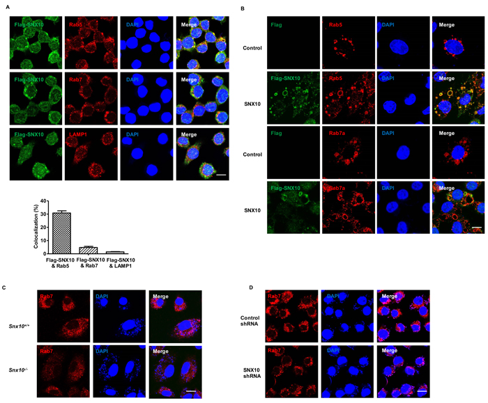 Figure 4: SNX10 promotes late endosome and late phagosome maturation in macrophage. A. Confocal images showing the co-localization of Flag-SNX10 (Green) with Rab5, Rab7 or LAMP1 (Red) in RAW264.7 cells line stably expressing Flag-SNX10. Bottom, The percentage of co-localization between Flag-SNX10 and Rab5, Rab7 or LAMP1 was measured as described in Materials and Methods. B. Confocal images showing the co-localization of Flag-SNX10 (Green) with Rab5, Rab7 (Red) in RAW264.7 cells line stably expressing control or Flag-SNX10 under LPS (1 μg/mL) stimulation for 24 h. Co-localzation of the two colors is depicted by yellow in the images. C., D. Confocal images showed the late endosomes or phagosomes (Rab7-positive) in WT and Snx10-/- BMDMs C. or RAW264.7 cells stably expressing control or SNX10 shRNA D. after infection with L. monocytogenes (MOI, 20) for 3 h. Scale bars represent 10 μm. Data are representative of three independent experiments with similar results.