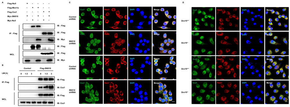 Figure 5: SNX10 recruits the Mon1-Ccz1 complex to endosomes. A. Co-immunoprecipitation of the interactions between SNX10 and Mon1a or Ccz1 in 293T cells. B. Co-immunoprecipitation of the interactions between SNX10 and Ccz1 in RAW264.7 cells stably expressing control or Flag-SNX10 after L. monocytogenes (MOI, 10) infection for the indicated time. C., D. Confocal images showing the co-localization of Ccz1 (Green) with Rab5 or Rab7 (Red) after L. monocytogenes (MOI, 10) infection for 3 h in RAW264.7 cells stably expressing control or SNX10 shRNA C., or in WT and Snx10-/- BMDMs D.. Co-localization of the two colors is depicted by yellow in the merged images. Scale bars represent 10 μm. Data are representative of three independent experiments with similar results.
