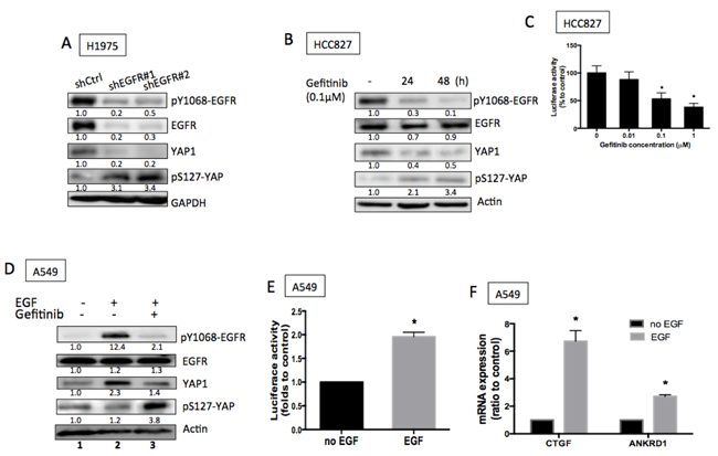 To further identify the regulation of YAP1 by EGFR signaling, we suppressed EGFR activity using either shEGFR or EGFR inhibitors in EGFR active-mutant cell lines. Knocking down EGFR in H1975 cells exhibited suppressed EGFR phosphorylation and suppressed total YAP1 protein levels together with enhanced phospho-YAP (S127) expression (Figure 2A). Reduced total YAP1 demonstrated by immunostaining in the presence of shEGFR or EGFR inhibitor (Figures S1A & B). Gefitinib, an EGFR inhibitor, blocked EGFR phosphorylation, reduced total YAP1 expression and upregulated phospho-YAP expression in HCC827 cells (Figure 2B). To detect whether total YAP1 protein levels correlate to its activity, we used a synthetic YAP1-responsive luciferase reporter, 8XGTIIC-Luc containing multimerized responsive elements of TEAD, as a read-out of the transcriptional function. Gefitinib concentration-dependently reduced the luciferase activity, confirming reduced YAP1 activity by blocking EGFR signaling in EGFR mutant cells (Figure 2C). Also, down-regulated CTGF and ANKRD1 detected in the presence of EGFR inhibition (Figure S1C & D).