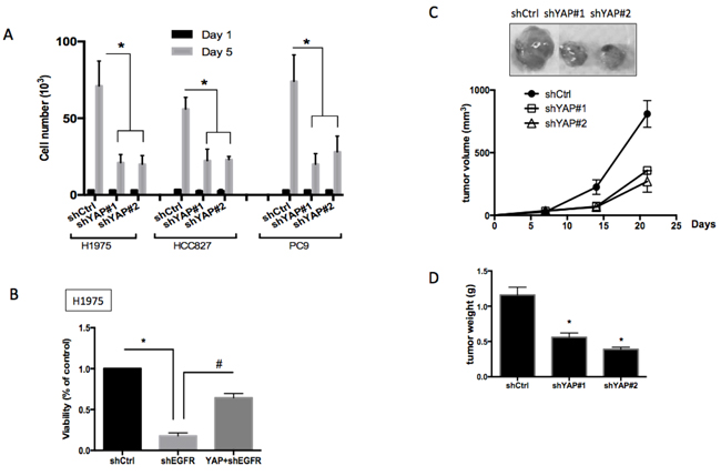 Figure 4: Roles of YAP1 in cell proliferation, survival and tumor growth. A. Cell proliferation assay for H1975, HCC827 or PC9 cells knocking down scramble control or YAP1. Cells knocking down YAP1 showed significantly reduced proliferation. The error bars represent the S.E. of four independent experiments. *P < 0.05. B. Knocking down EGFR in the EGFR-dependent H1975 cells reduced cell viability and forced YAP1 expression rescued loss-of-EGFR-caused viability loss. The error bar represents the S.E. (n = 4). *P < 0.05 control compared with shEGFR, and #P < 0.05 shEGFR compared with YAP1+shEGFR. Subcutaneous injection of H1975 cells knocking down scramble control or YAP1 into nude mice. Reduced tumor size C. and reduced tumor weight D. was detected in YAP1 knockdown groups. The data are presented as the mean±S.E. (n = 6 per group).*P < 0.05.