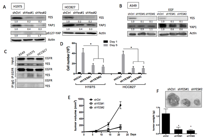 Figure 5: Role of YES in EGFR-mediated YAP1 expression and function. A. Knockdowns of YES in EGFR mutant cell lines, H1975 and HCC827 caused reduced YAP1 expression. B. Knockdowns of YES did not reduce YAP1 level in A549 (left panel). EGF (1 h) triggered YAP1 expression was diminished in YES knockdown groups (right panel). C. Immunoprecipitated EGFR can detect YES expression in H1975 cells but not in A549. D. Knockdowns of YES caused decreased cell proliferation in H1975 cells. The error bars represent the S.E. of three independent experiments. *P < 0.05. Subcutaneous tumor xenograft model showed knockdowns of YES in H1975 cells reduced tumor size E. and tumor weight F. The data are presented as the mean±S.E. (n = 6 per group).*P < 0.05.