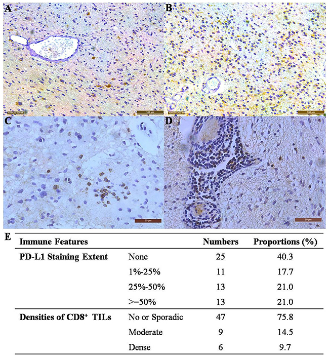 Figure 2: Immune features of resectable brainstem gliomas. (A) PD-L1 staining extent = 15% (200× magnification). (B) PD-L1 staining extent = 75% (200× magnification). (C) Moderate infiltration by CD8+ T cells within the tumor (400× magnification). (D) Dense infiltration by CD8+ T cells (200× magnification). (E) The extent of PD-L1 staining and infiltrative densities of CD8+ T cells in resectable brainstem gliomas.