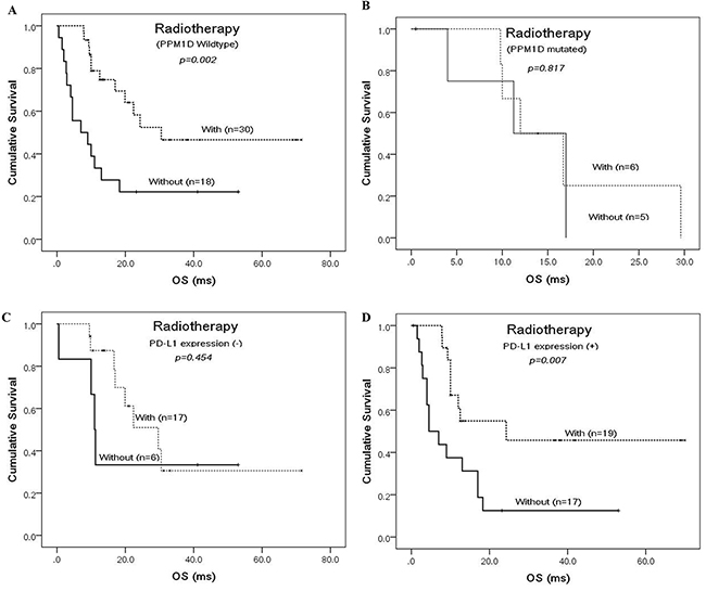 Figure 4: Prognostic factors that predict whether brainstem glioma patients benefit from radiotherapy or not. Kaplan-Meier curves according to receiving radiotherapy for the cohort of brainstem glioma patients, which were classified as PPM1D-wildtype (A) and mutated (B) group or PD-L1 expression negative (C) and positive (D) group.