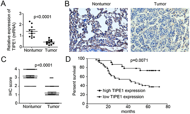 To confirm TIPE1 expression in lung cancer tissues, we examined TIPE1 mRNA expression in ten paired nontumor and tumor tissue samples derived from lung cancer patient. qPCR results indicated that TIPE1 mRNA was 8.5-fold lower in tumor tissues than in nontumor tissues (Figure 1A). Immunohistochemistry for TIPE1 expression in lung cancer tissues array (Table 1) indicated that TIPE1-positive cells were rarely observed among lung cancer cells (Figure 1B). Meanwhile, strong and intermediate immunostaining was observed in the nontumor lung tissues (Figure 1B). In addition, mean IHC score in tumor tissues was 1.20±0.16, whereas 3.18±0.10 in nontumor tissue (n=45, p<0.0001, Figure 1C). The Kaplan–Meier survival curve demonstrated that patients with low TIPE1 expression have dramatically shorter survival than those with high TIPE1 expression (p=0.0071, Figure 1D).
