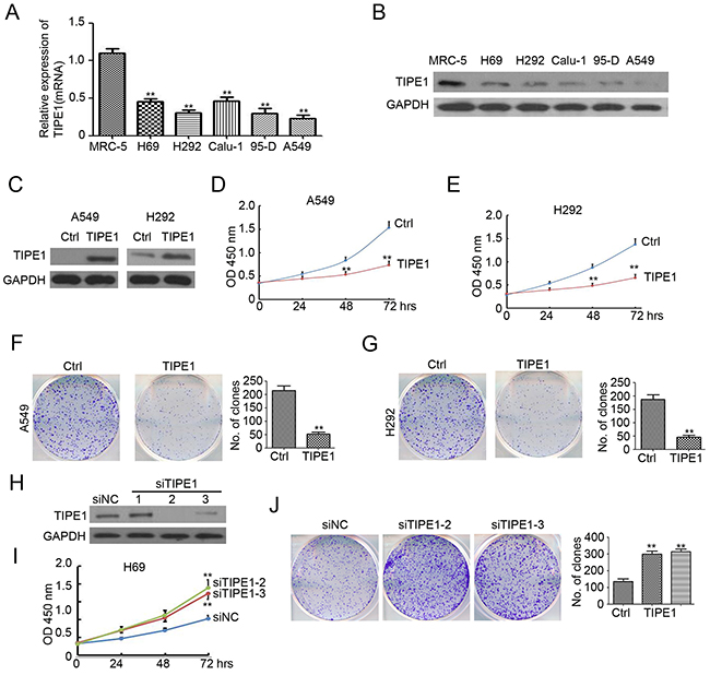 Figure 2: TIPE1 inhibits lung cancer growth and colony formation. (A and B) TIPE1 mRNA and protein expression in five lung cancer cell lines and normal lung epithelial cells MRC-5 was determined by qPCR and western blotting, respectively. GAPDH was used as loading control. (C) TIPE1 protein expression in A549 and H292 cells was determined by western blotting. GAPDH was used as loading control. (D and E) Growth of A549 and H292 cells was determined by CCK8 assay (n=5; **, p<0.01, compared with Ctrl group). (F and G) Colony formation was performed in A549 and H292 cells (n=3; **, p<0.01, compared with Ctrl group).