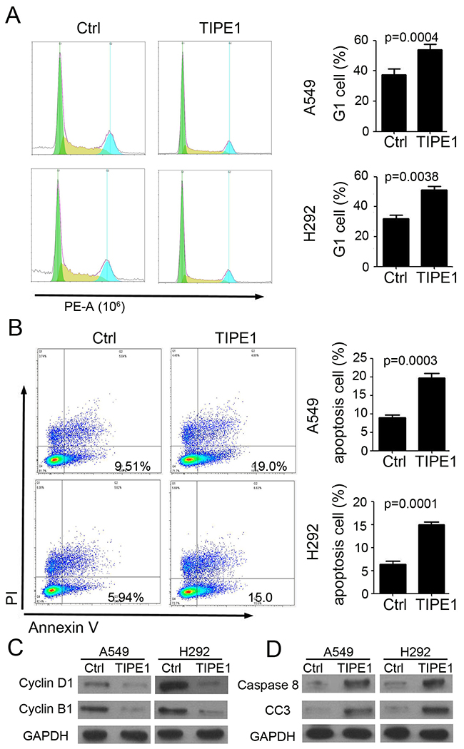 Next, we investigated the mechanism of TIPE1 on lung cancer cell growth by flow cytometry. And the results indicated that TIPE1 effectively arrest A549 and H292 proliferation via inhibiting cell enter into G1 cycle (A549 cell: 17.24 % G1 cell in TIPE1 group versus 36.12% in Ctrl group; H292 cell: 17.79 % G1 cell in TIPE1 group versus 43.38% in Ctrl group; Figure 3A). Annexin V and PI staining indicated that TIPE1 induced earlier apoptosis in both A549 (Ctrl: 9.51% and TIPE1: 19.0%) and H292 (Ctrl: 5.94% and TIPE1: 15.0%) cell (Figure 3B). In addition, TIPE1 inhibited cell cycle check point protein Cyclin D1 and B1 expression (Figure 3C). Moreover, TIPE1 also promoted caspase 8 and cleaved caspase-3 expression, that are pivotal mediators involved in apoptosis (Figure 3D). The above data proved the effect of TIPE1 on lung cancer cell proliferation and apoptosis through regulating related protein expression.