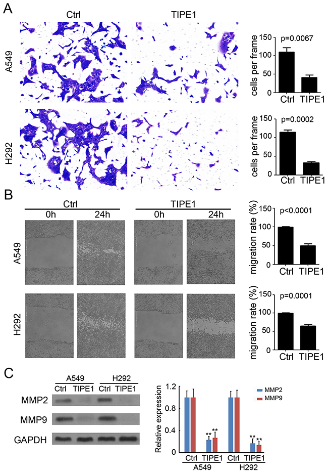 An invasion assay was performed in Transwell chambers containing 8-μm pore size inserts, the upper surfaces of which were coated with Matrigel matrix. A549 and H292 cells were suspended in serum-free media and plated on the upper chambers. After 48 hours of culture, TIPE1 significantly prevented A549 and H292 cell invasion by approximately 65% and 78%, respectively (Figure 4A). Meanwhile, a wound-healing assay was used to evaluate the effect of TIPE1 on cancer cell migration. As shown in Figure 4B, compared with Ctrl group, TIPE1 dramatically blocked A549 and H292 cell migration by approximately 52% (P<0.0001) and 41% (P=0.0001), respectively. Furthermore, western blotting was performed to detect matrixmetalloproteinases (MMP) expression, which play a key role in tumor invasion and migration. We found TIPE1 significantly downregulated MMP2 and MMP9 expression by approximately 70-80% both in A549 and H292 cells (Figure 4C). Collectively, we demonstrated the inhibition role of TIPE1 on lung cancer cell invasion and migration via regulating MMP expression.