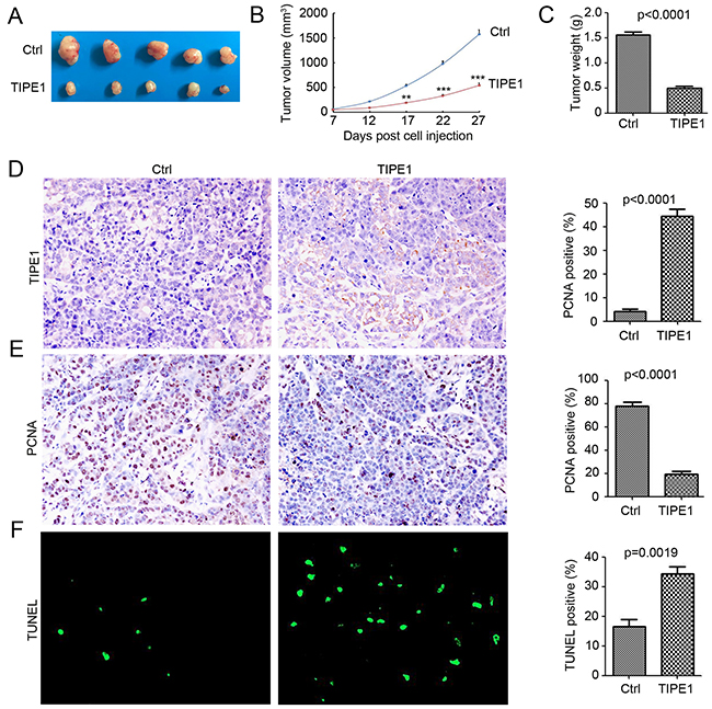 Figure 5: TIPE1 inhibited tumorigenesis in vivo. (A) Ten BALB/c nude mice were randomly divided into two groups (5 mice per group) and subjected to injection with A549-Ctrl and A549-TIPE1 cancer cells. Representative tumors were imaged after sacrifice to visually assess tumor growth. (B) The average tumor volume in each group (n=5) is shown as a function of time (**, p<0.01; ***, p<0.001, compared with Ctrl group). (C) tumor weight in each group (n=5) is shown (**, p<0.01, compared with Ctrl group). (D and E) IHC for analysis of TIPE1 and PCNA protein expression in Ctrl and TIPE1 A549 tumor tissues. Percentage of positive cells were analyzed (n=5). (F) TUNEL for analysis of apoptosis cells in Ctrl and TIPE1 A549 tumor tissues. Percentage of apoptosis cells were analyzed (n=5).