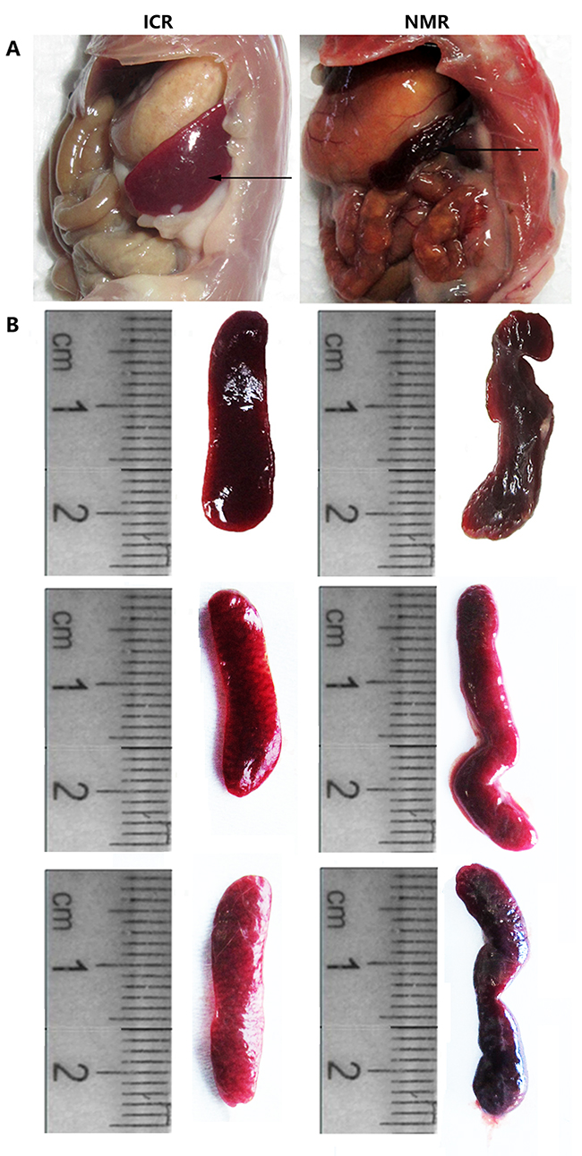 Figure 1: Differences in tissue anatomy characteristics between NMR and ICR mouse spleens. (A) The representative images show the spleen anatomical location in ICR mice and NMRs. (B) The pictures show the spleen appearance in ICR mice and NMRs.