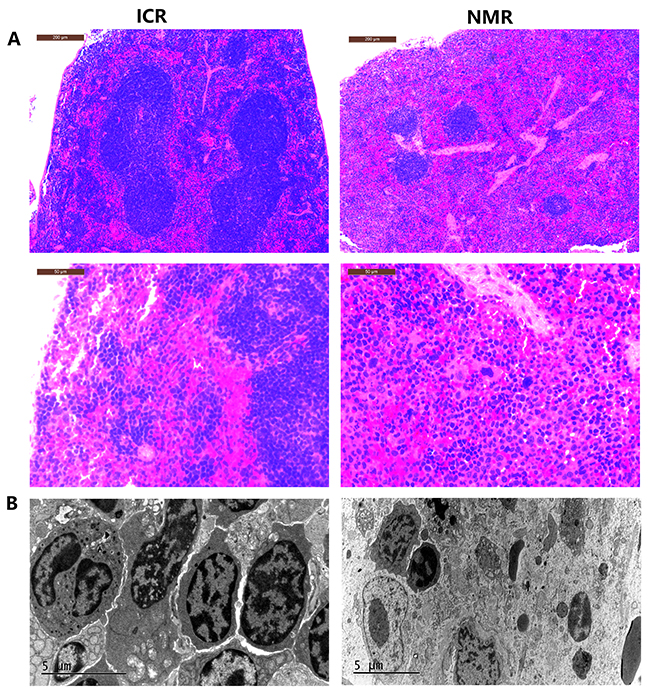 Figure 2: Differences in tissue morphology characteristics between NMR and ICR mouse spleens. (A) The representative images show H&E staining of spleens in ICR mice and NMRs (10s, 40n magnification). (B) The pictures show the splenic structure in ICR mice and NMRs using scanning electron microscopy techniques.
