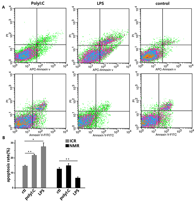 Figure 4: PolyI:C and LPS induce apoptosis in mouse and naked mole rat macrophages. (A) Macrophages were treated with 10 ng/ml polyI:C or 1 ng/ml LPS for 12 h. The negative control was treated with PBS. Apoptosis was analyzed with PI and annexin V staining by flow cytometry. The upper panels represent the results for mice, and the lower panels correspond to naked mole rats. (B) The graph indicates the percentage of apoptotic cells (means ± SD). *P<0.05, **P<0.01.