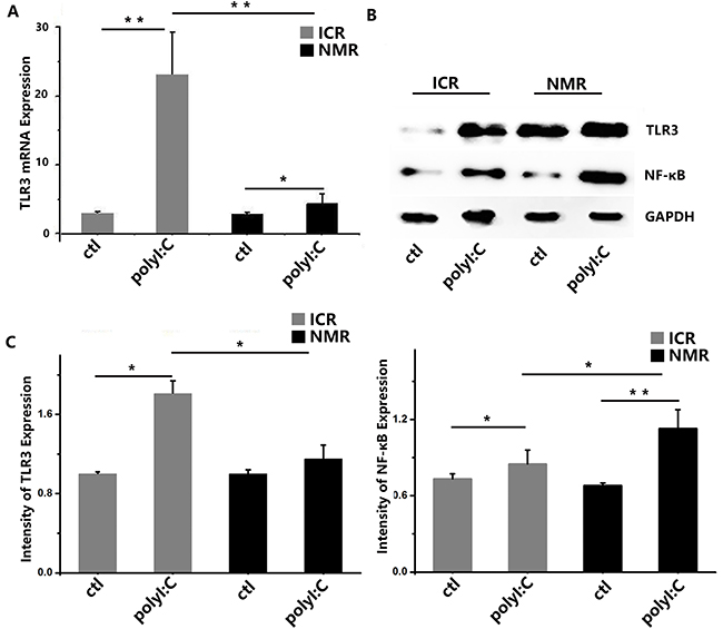 Figure 5: PolyI:C-stimulated macrophage inflammatory responses in naked mole rats and ICR mice. (A) Toll-like receptor 3 mRNA expression levels in macrophages were measured in both naked mole rats and ICR mice. After treatment, mouse and NMR macrophages showed increased TLR3 mRNA expression. (B) Western blot analysis of TLR3 and NF-κB in macrophages taken from ICR mice and NMRs before or after treatment. (C) Western blot analysis of TLR3 and NF-κB in macrophages taken from ICR mice and NMRs before or after treatment. Results of (A, C) are presented as the means±SD (*P<0.05, **P<0.01, independent-samples t test).