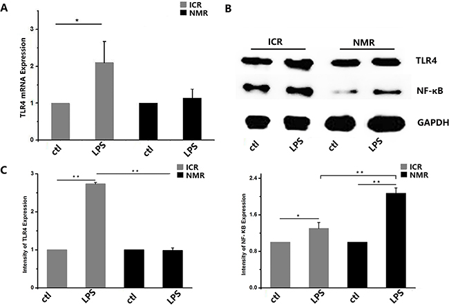 Figure 6: LPS-stimulated inflammatory responses in naked mole rat and ICR mouse macrophages. (A) Toll-like receptor 4 mRNA expression levels were measured in both naked mole rats and ICR mice. After treatment, ICR mouse and NMR macrophage TLR4 mRNA expression increased. (B) Western blot analysis of TLR4 and NF-κB in macrophages taken from ICR mice and NMRs before or after treatment. (C) Western blot analysis of TLR4 and NF-κB in macrophages taken from ICR mice before or after treatment. Results of (A,C) are presented as the means±ea (*P<0.05,**P<0.01, independent-samples t test).