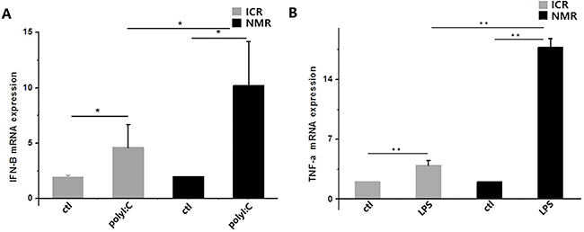 Figure 7: PolyI:C- and LPS-stimulated macrophage cytokine expression in naked mole rats and ICR mice. (A) Interferon-β mRNA expression levels in macrophages were measured in both naked mole rats and ICR mice. Both types of macrophages had increased IFN-β mRNA expression. (B) Tumor necrosis factor-α mRNA expression levels in macrophages were measured in both naked mole rats and ICR mice. Macrophage TNF-α expression was significantly increased. The results of (A,B) are presented as the means±ea (*P<0.05,**P<0.01, independent-samples t test).