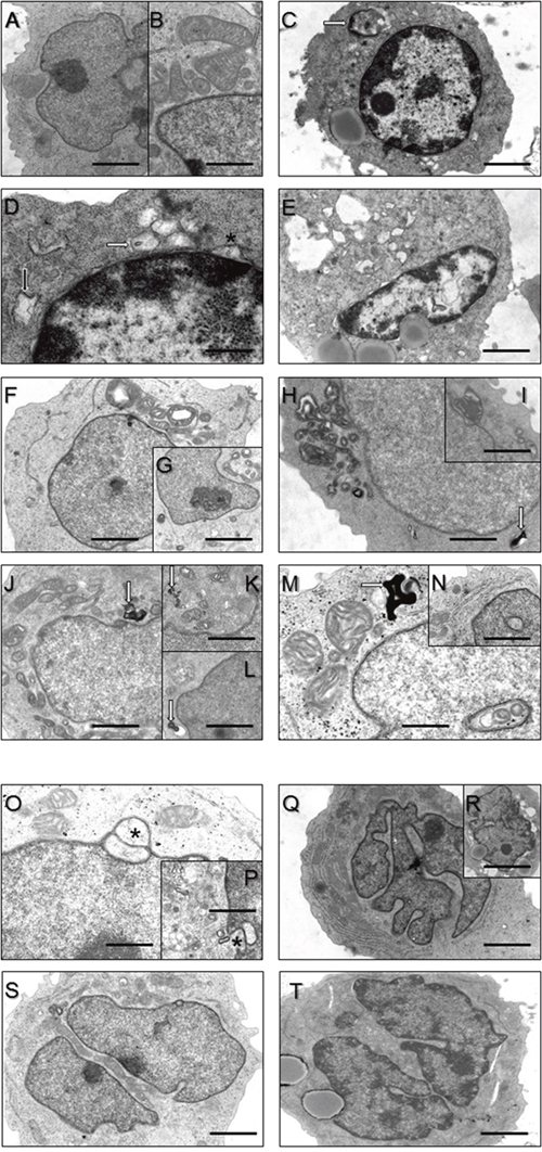 Figure 2: Ultrastructural findings in control lymphoblastoid cells (LC) (A, B) and LC derived from MSS patients (C-V). (A, B) Regular organelle structures in LC derived from healthy probands. Scale bars in A = 5 μm; in B = 2 μm. (C) Hyperchromasia of the nucleus and cytoplasmic accumulation of electron-dense material (white arrow) in a LC derived from a MSS patient. Scale bar = 7.5 μm. (D) Higher magnification of (C) emphasizing widened rough ER (black arrow) and outfoldings of the lifted-off nuclear envelope (asterisk) as well as accumulation of vesicular structures partially filled with electron-dense material. Scale bar = 1 μm. (E) Another representative MSS patient- derived LC presenting with hyperchromasia of the nucleus, increased outfoldings of the lifted-off nuclear envelope, irregular accumulation of electron-dense material within the nucleoplasm and large cytosolic vacuoles. Scale bar = 7.5 μm. (F-I) proliferation of disorganized mitochondria. Cell depicted in the inset G in addtion to disorganized mitochondria also shows (electron-lucent) vacuole. Scale bars in F = 5 μm; in H = 4 μm; in G, I = 10 μm. Occasionally accumulation of myelin-like autophagic material (white arrows in H, J-M). Scale bars in H, J = 4 μm; in K, L = 7 μm; in M = 2 μm. (M, N) show nuclei with “cytoplasmic halos” partially filled with abnormal mitochondria (M). Scale bar in N = 6 μm. (O, P) Nuclear envelope protrusions (asterisks) and considerable vesicular proliferations. Scale bars in O = 3 μm; in K = 7 μm. (Q, R) Irregularly shaped/lobulated and (S, T) splitted/ fragmented nuclei. Scale bars in Q = 7 μm; in S, T = 5 μm.