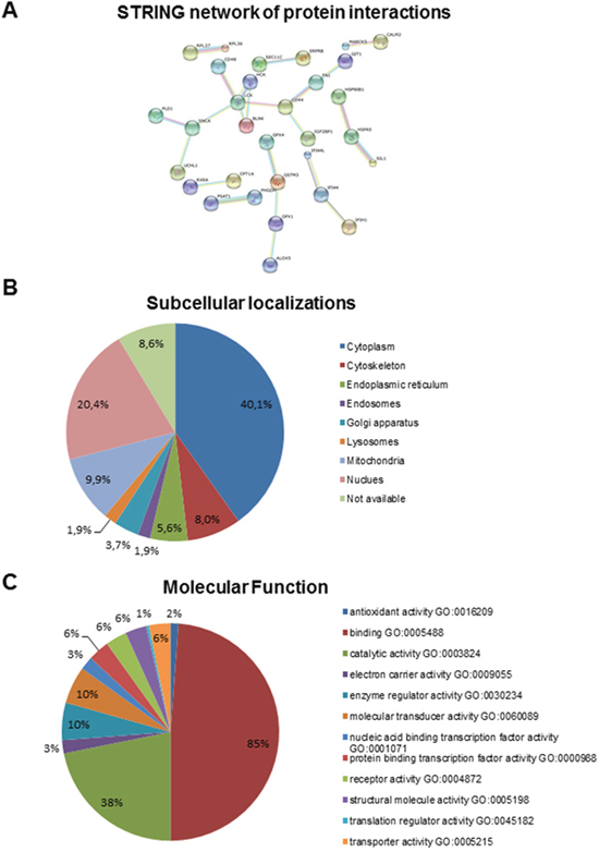 Figure 3: (A) STRING-analysis of interaction networks of proteins altered in SIL1-deficient LCs revealed connective groups of eleven, four, three (twice) and two (quintuply) proteins, respectively. (B, C) Summary of predicted gene product function and location using gene ontology terms. Gene ontology (GO) terms for annotated human proteins were extracted, if present, from the GO database and sorted into the immediate subcategories for molecular function, cellular component and biological process. The GO subcategory and percentage relative to the total number of extracted terms is indicated.