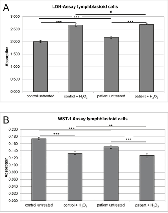 MSS-derived LC and control LC were pooled respectively and seeded into 96-well plates (5,000 cells per well) with RPMI 1640 medium with L-glutamine (PAA) containing 20 % FCS (Gibco), 1 % penicillin/ streptomycin (PAA) and 0.05 % amphotericine. H2O2 treatment of the cells (25 μM for 1 hour) was carried out in order to proof the hypothesis that efficient activation of pro-survival mechanisms in MSS-patient derived LC prevents these cells from accelerated cell death caused by additional stress burden. The cytotoxicity assay (Roche Diagnostics®) quantifies cytolysis based on the measurement of LDH activity released from damaged cells and was performed according to the manufacturer’s protocol. Thereby, LDH release could be related to disruption of the plasma membrane. Measurement at 490 nm (reference 630 nm) was carried out via kinetic microplate reader (Infinite M200; Tecan) 30 minutes after application. Cell proliferation, reflecting mitochondrial activity and cellular viability, was determined using WST-1 reagent (Roche Diagnostics®) according to the manufacturer’s protocol. WST-1 conversion to the red soluble formazan via mitochondrial succinate-tetrazolium reductase was measured at 450 nm (reference 630 nm) via kinetic microplate reader (Infinite M200; Tecan) 4 hours after application. Experiments were done in triplicate and repeated three times.