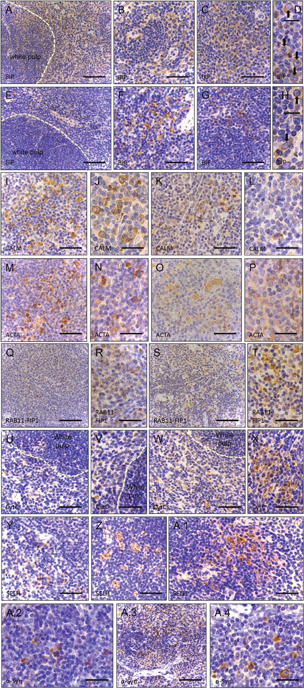 Figure 5: Immunohistochemistry of paraffin sections of paraformaldehyde-fixed spleen specimens of 26-week old control (wt) and of Sil1 mutant mice. (A-D) BiP immunoreactivity of the ER and of the nuclear envelope (black arrows in D) in wt animals. Scale bars A = 100 μm; in B, C = 110 μm; in D = 50 μm (B-D = red pulp). Whereas overall BiP immunoreactivity of the ER is reduced in Sil1 deficient animals, focal enrichment of BiP within the nuclear envelope (black arrows in H) is similar to the control animals. Scale bars E = 100 μm; in F, G = 110 μm; in H = 50 μm (E-H = red pulp). Calmodulin (CALM) immunoreactivity of the red pulp in wild-type animals (I-J) and reduced immunoreactivity of the red pulp in Sil1 mutant animals (K, L). Scale bars in I, K = 110 μm; in J, L = 75 μm. Cells of white and red pulp show stronger actin (ACTA) immunoreactivity in wt (M, N) than in Sil1 mutant animals (O, P). Scale bars in M, O = 110 μm; in N, P = 75 μm. (Q, R) Less intense RAB11-FIP1 immunoreactive structures in the red pulp of wt animals compared to in Sil1 mutant animals (S, T). Scale bars in Q, S = 100 μm; in R, T = 140 μm. (U, V) Cytochrome C (CytC) reduction in wt animals compared to Sil1 mutant littermates (W, X). Scale bars in U, W = 110 μm; in V, X = 140 μm. Analogous reduction of Selenoprotein H (SELH) immunoreactivity in wt (Y) in comparison to SIL1 deficient splenic cells (Z, A.1). Scale bar in Y = 100 μm; in Z, A.1 = 110 μm. α-synuclein (α-Syn) staining is less prominent in wt splenic cells (A.2) compared to cells in Sil1 mutant mice (A.3, A.4). Scale bars in A.2, A.4 = 75 μm; in A.3 = 150 μm.