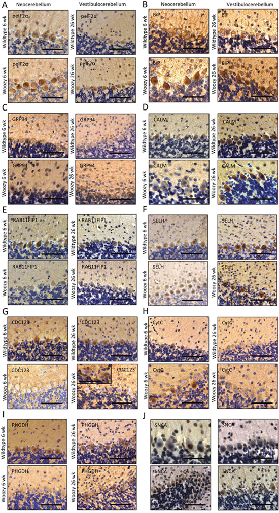 Figure 7: Immunohistochemistry of paraffin sections of paraformaldehyde-fixed cerebellar specimens of 6-week and 26-week old control (wt) and of Sil1 mutant mice (woozy). (A) phospho-eIF2α immunoreactivity of the cerebellar brain areas. Scale bars = in neocerebellum 50 μm, in vestibulocerebellum 75 μm. (B) BiP immunoreactivity of the ER and of the nuclear envelope. Scale bars = in neocerebellum 45 μm, in vestibulocerebellum 60 μm. Both UPR-related proteins show increased immunoreactivity in Sil1-defienct PCs of neo- and vestibulocerebellum (lower panels) compared to wt littermates (upper panels). (C) PCs of woozy animals (lower panels) show no stronger GRP94 immunoreactivity, neither in the neo- nor in the vestibulocerebellum compared to wt animals (upper panels). Scale bars = in neocerebellum 50 μm, in vestibulocerebellum 60 μm. (D) CALM reduction in the degenerating PCs of the neo- but not in the vestibulocerebellum (lower panels) of woozy animals compared to similar brain areas of wt littermates (upper panels). Scale bars = in neo- and vestibulocerebellum of wildtype animals 60 μm, in neo- and vestibulocerebellum of woozy animals 50 μm. (E) Compared to wt animals (upper panel), decreased RAB11-FIP1 immunoreactivity of Sil1-deficient PCs in both, the neo- and the vestibulocerebellum (lower panels) is detectable. Scale bars = in neocerebellum 60 μm, in vestibulocerebellum 75 μm. (F) SELH immunostaining shows no changes in protein abundance in Sil1-deficient PC populations (lower panels) compared to controls (upper panels). Scale bars = in neo- and vestibulocerebellum 75 μm. (G) CDC123 shows decreased immunoreactivity in cell bodies of Sil1-deficient PCs but is increased at the plasma membrane of same cells (lower panels) compared with PCs of wt animals (upper panels). This peripheral enrichment is more apparent in disease-resistant PCs of the vestibulocerebellum of woozy animals. Scale bars = in neocerebellum and vestibulocerebellum 65 μm, in inset 40 μm. (H) CytC is increased in degenerating PCs of the neocerebellum of woozy animals but not in surviving PCs of the vestibulocerebellum of woozy mice (lower panels) compared to respective control mice (upper panel). Scale bar = in neo- and vestibulocerebellum of wildtype animals 65 μm, in neo- and vestibulocerebellum of woozy animals 50 μm. (I) PCs of Sil1-deficient neocerebellum show decreased immunoreactivity compared to PCs of Sil1-deficient vestibulocerebellum (lower panel) and PCs of similar brain areas of wt controls (upper panel). Scale bar = in neocerebellum of wildtype animal 60 μm, in vestibulocerebellum of wildtype animal 70 μm, in neo- and vestibulocerebellum of woozy animals 75 μm. (J) SNCA/ α-synuclein shows increased immunoreactivity in PC nuclei in the neocerebellum of woozy animals but not in surviving PCs of the vestibulocerebellum of wt mice (lower panels). Sclale bar = in neocerebellum of wildtype animal 35 μm, in vestibulocerebellum of wildtype animal 40 μm, in neocerebellum of woozy animal 75 μm, in vestibulocerebellum of woozy animal 60 μm.