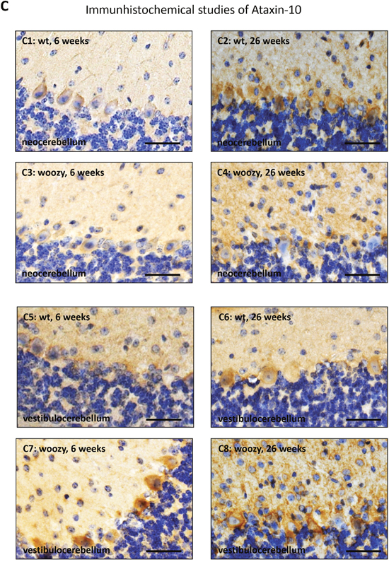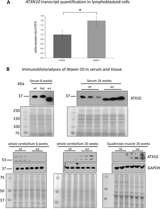 Figure 8: Further studies of ataxin-10 transcript and protein abundance. (A) Targeted transcript studies of ATXN10 utilizing LCs derived from healthy controls and MSS-patients (same batch of cells used for the proteomic studies) revealed a 1.6-fold increase in patient-derived LCs. (B) Immunoblot-based examination of ATNX10 level in sera derived from woozy animals and wildtype littermates (as well as one heterozygous animal). Whereas in sera of the wildtype littermates and in the heterozygous animal a band at 37 kDa could consistantly be detected, in woozy sera the utilized antibody detected a band with a molecular weight lower than 37 kDa. Coomasie blue staining has been carried out to demonstrate equal protein loading. Further immunoblot-based investigation of ataxin-10 protein level in whole cerebellar protein lysates derived from 6- and 26-week old woozy and control animals shows a reduced netto abundance in 6-week old animals when PC degeneration in initiated (lower left panel). In contrast, in whole cerebellar protein lysates derived from 26-week old animals (surviving PC population in the vestibulocerebellum), increased abundance can be detected (lower panel in the middle). In both, the 6- and the 26-week old animals an addional band (of higher molecular weight; approx. 65 kDa) showing similar regulation of protein abundance can be detected. Coomasie blue staining has been carried out to demonstrate equal protein loading. Investigation of whole quadriceps muscle protein lysates derived from 26-week old woozy and control animals revealed increased ataxin-10 abundance in the diseased muscle of the Sil1 mutant animals (lower right panel). Here, only one band at the predicted ataxin-10 size of 53 kDa could be detected. Coomasie blue staining has been carried out to demonstrate equal protein loading. (C) Immunohistochemistry of paraffin sections of paraformaldehyde-fixed specimens of 6-week and 26-week old control (wt) and of Sil1 mutant mice (woozy) revealed reduced ataxin-10 abundance in the vulnerable neocerebellum at the age of 6- and 26-week old woozy animals compared to the wildtype littermates (C1-C4) and increased ataxin-10 abundance in the non-vulnerable vestibulocerebellum at the age of 6- and 26-week old woozy animals compared to the wildtype littermates (C5-C8). Increased immunoreactivity can be observed in PCs and the neuropil. Sclale bars = 40 μm. No obvious changes in ataxin-10 abundance can be detected in the spleen, the heart and the kidney of Sil1 mutant animals compared to the wildtype controls (C9-C14; 26-week old). Scale bars: in C9 and C10 = 50 μm, in C11 and C12 = 60 μm, in C13 and C14 = 40 μm. Increased immunoreactivity in motoneurons of Sil1 mutant animals compared to the wildtype controls (C15 and C16; 26-week old). Scale bars = 50 μm. Increased ataxin-10 immunoreactivity can be observed in diseased and degenerating muscle fibres of Sil1 mutant animals compared to the wildtype controls (C17-C21; 26-week old). Scale bars: in C17 and C18 = 65 μm, in C19 = 4 μm, in C20 = 30 μm, in C21 = 100 μm.