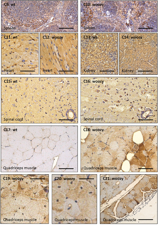Fresh spleen samples of 12 mice and fresh cerebellar, spinal cord, kidney, heart and quadriceps muscle samples of 6 mice were directly fixed in 4 % buffered formalin for subsequent immunohistochemical studies (see below) and cerebellar as well as quadriceps muscle samples of 6 mice and spleen of four mice were directly lysed for subsequent immunoblot studies (see below).