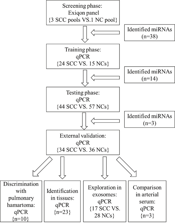 A multiphase study was designed to identify specific serum miRNAs for the diagnosis of lung SCC (Figure 1). In the initial screening stage, 30 serum samples from lung SCC patients and 10 from NCs were randomly selected and pooled as 3 lung SCC samples and 1 NC sample (10 samples were pooled as 1 sample). ExiqonmiRCURY-Ready-to-Use PCR-Human-panel-I+II-V1.M (Exiqon miRNA qPCR panel, Vedbaek, Denmark) were applied to identify miRNAs whose expression were altered in lung SCC samples compared to NCs as previously described. In the training stage, serum samples from 24 lung SCC patients and 15 NCs were used to confirm the dysregulated miRNAs assessed by the screening stage. Subsequently in the testing stage, we refined the miRNAs by 44 lung SCC patients and 57 NCs. An external patient cohort of 34 lung SCC patients and 36 NCs were used to assess the diagnostic value of the selected miRNAs. Additionally, another 10 patients with pulmonary hamartoma was used to validate the diagnostic performance of the candidate miRNAs. The panel of serum miRNAs was further validated in 23 pairs of tissue specimens and matched normal tissues. Serum exosomal miRNAs were also identified in 17 lung SCC patients and 28 NCs to further discover the potential form of miRNAs in the peripheral blood. Arterial and venous blood samples from 3 lung SCC patients were obtained to compare the difference of miRNA expression between peripheral arterial and venous serum.
