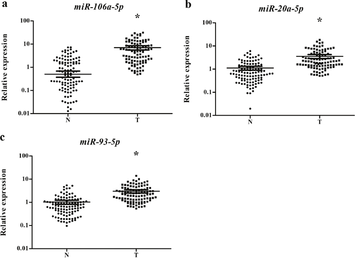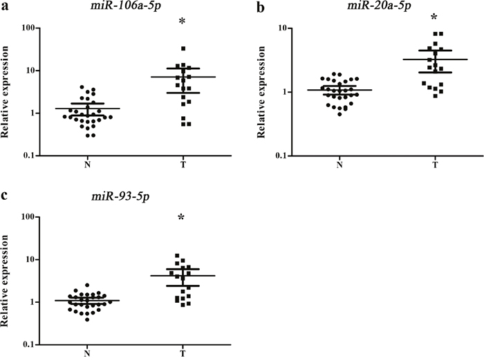 Figure 4: Expression of the three miRNAs in the tumor tissues of 23 pairs of lung SCC patients. (a) miR-106a-5p; (b) miR-20a-5p; (c) miR-93-5p; N: normal controls; T: tumor. Horizontal line: mean with 95% CI. *: P < 0.001; **:P < 0.05.