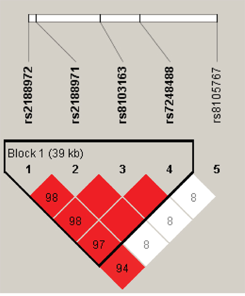 Figure 1: Linkage disequilibrium patterns of five SNPs in ZNF208.