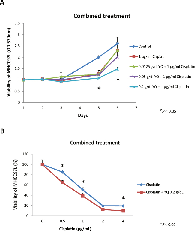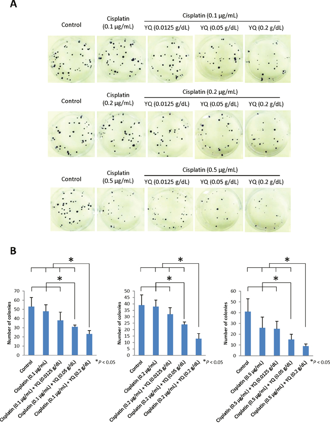 To examine whether YQ23 may sensitize Cisplatin based chemotherapy in HCC, MHCC97L cells were cultured under the presence of Cisplatin (1μg/mL) and treated with different dosage of YQ23. The dosage of Cisplatin was determined by dose-response curve. We found that YQ23 significantly suppressed the proliferation of HCC cells under Cisplatin treatment in a dose dependent manner by MTT assay (Figure 1A). The peak effect of YQ23 was shown at the concentration of 0.2g/dL. YQ23 significantly suppressed the proliferation of tumor cells at day 5 and 6. It implied that the suppressive effect of YQ23 was more obvious at later phase. No significant effect was observed by YQ23 single treatment (Supplementary Figure 1). After that, we further examine the suppressive effect of YQ23 (0.2g/dL) under different concentration of Cisplatin (Figure 1B). We found that YQ23 could most significantly sensitize Cisplatin based chemotherapy at lower dosage of Cisplatin (0.5μg/mL) at day 7 (Figure 1B). In order to examine the long time effect of YQ23 on tumor cells growth, MHCC97L cells were cultured under the combined treatment for 2 and 3 weeks. Again, we observed that YQ23 significantly suppressed the proliferation of HCC cells under Cisplatin in a dose dependent manner in colony formation assay (Figure 2A and 2B).