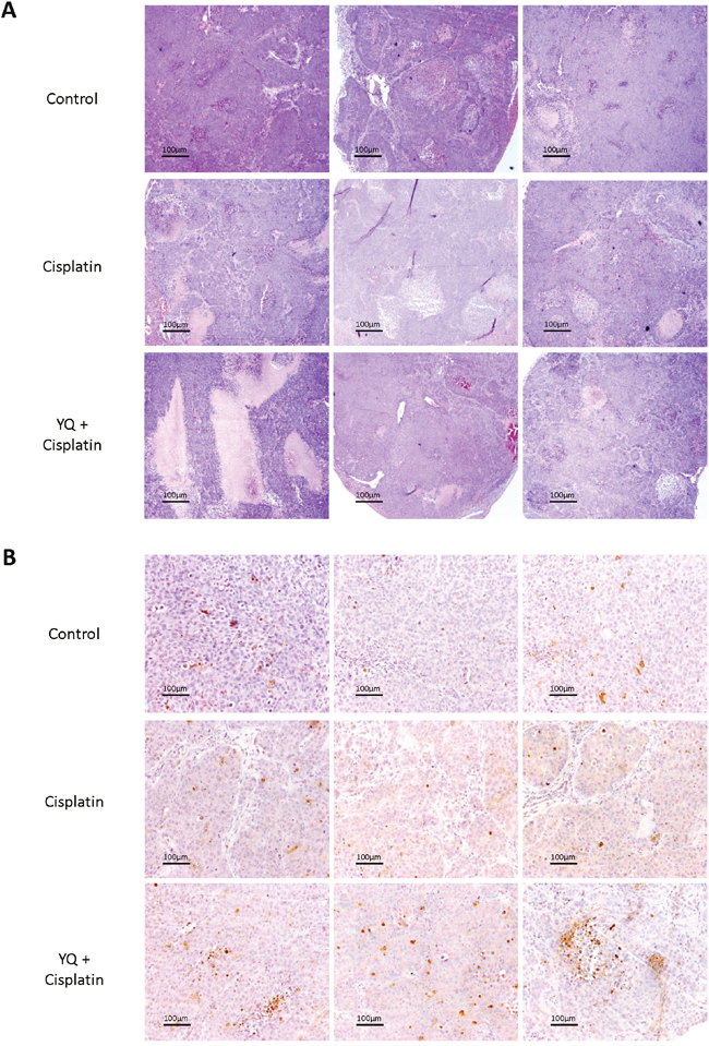 To examine whether YQ23 may sensitize Cisplatin based chemotherapy in vivo, the nude mice orthotopic xenograft liver cancer model was established. Cisplatin and YQ23 were administrated into the mice once a week after tumor implantation. The experiments were performed in duplicate. We observed that YQ23 kinetically sensitized Cisplatin based chemotherapy at week 5 and week 6 after tumor implantation (Figure 3A). No significant effect was observed by Cisplatin single treatment. The tumor volume was significantly lower by YQ23 treatment combined with Cisplatin therapy when the nude mice were sacrificed (Figure 3B). More necrotic areas were observed in combined treatment group by H&E (Hematoxylin and eosin) staining (Figure 4A). More apoptotic cells were induced by combined treatment examined by TUNEL (Terminal deoxynucleotidyl transferase dUTP nick end labeling) assay (Figure 4B).