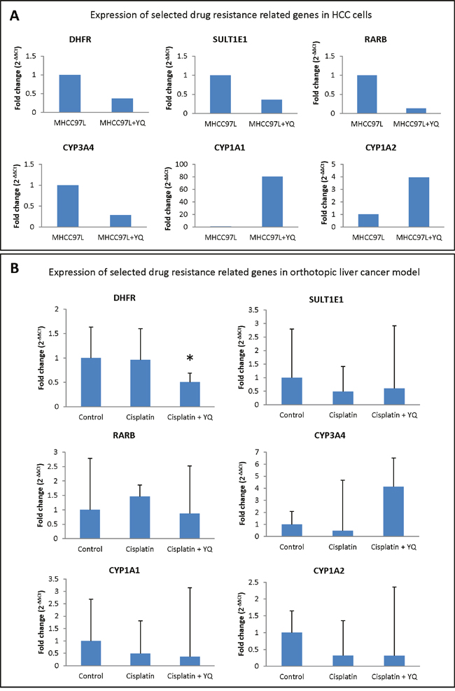 In order to explore the mechanism of YQ23 sensitizing Cisplatin based chemotherapy, the drug resistance related pathways were further analyzed using RT2 Profiler PCR array. Among 84 drug resistance related genes, using 2-fold as cutoff point, 4 down-regulated genes (DHFR, SULT1E1, RARB and CYP3A4) and 2 up-regulated genes (CYP1A1 and CYP1A2) were identified in HCC cells after YQ23 treatment (Table 1, Figure 5A). After that, the expressions of these 6 potential gene candidates were further validated in orthotopic xenograft liver cancer model. We found that only DHFR was significantly down-regulated upon YQ23 treatment combined with Cisplatin (Figure 5B). No significant change was found for the other 5 potential candidates. It implied that down-regulation of DHRF may be one of the reasons responsible for YQ23 sensitizing Cisplatin based chemotherapy.